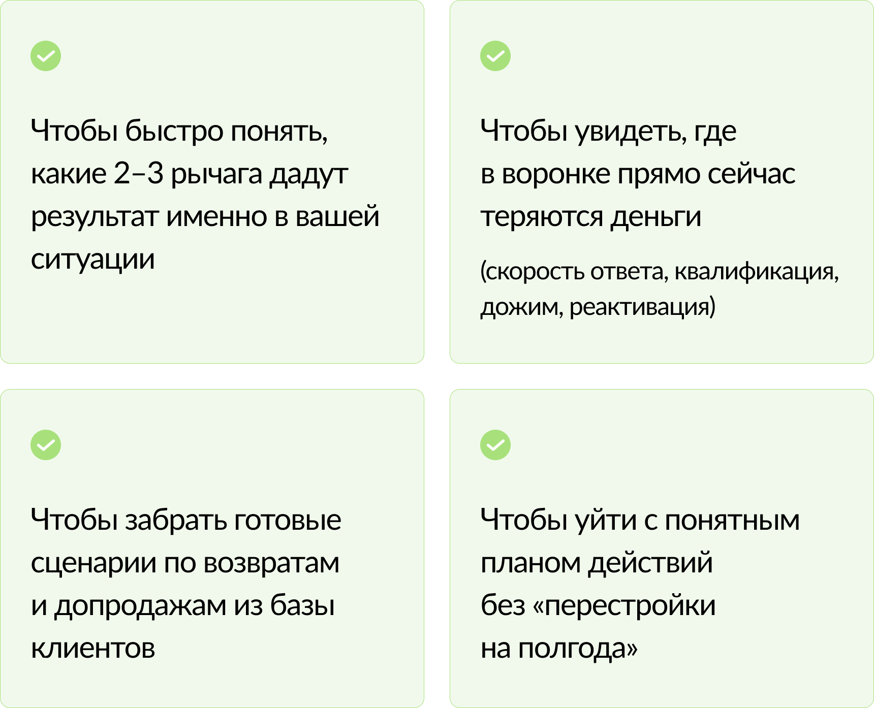 Сейчас мы открыли доступ к интенсиву «Пересборка продаж в кризис: как выстроить маркетинг и продажи, чтобы росла выручка и прибыль», где пошагово разбираем, как выстроить управляемый рост и сделать выручку прогнозируемой при помощи правильно настроенных связок. |