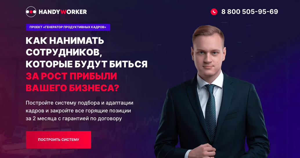 Подбор сотрудников — это трудозатратная история. А находить и интегрировать сильных людей труднее в разы. Поэтому бессистемные попытки лишь демотивируют и не дают результата. Если вы хотите, чтобы ваш бизнес выжил и процветал, нужна система. | | | | Построим систему подбора в вашей компании с гарантией результата | | | Рекрутинг одного сильного руководителя стоит от нескольких сотен тысяч до миллиона рублей. Выстроить команду в малом и среднем бизнесе, используя этот инструмент, — за рамками бюджета. Поэтому мы создали уникальный проект по созданию системы подбора специально для владельцев малого и среднего бизнеса. Мы помогли уже более чем 50 компаниям выстроить систему и решить кадровый вопрос раз и навсегда. За счет совместного обучения владельца и команды технология остается в компании навсегда. А настойчивость HR-экспертов и помощь во внедрении позволяет внедрить все элементы технологии. Оставьте заявку на участие в проекте и создайте команду мечты, которая вытащит вас из операционки. | | | | Позвоните нам, если у вас остались вопросы! 8 (800) 302-84-04 | | | Вы можете отписаться от рассылки в любое время, пройдя по ссылке. | | | © Copyright 2022 Handy Worker. Все права защищены. | | | |