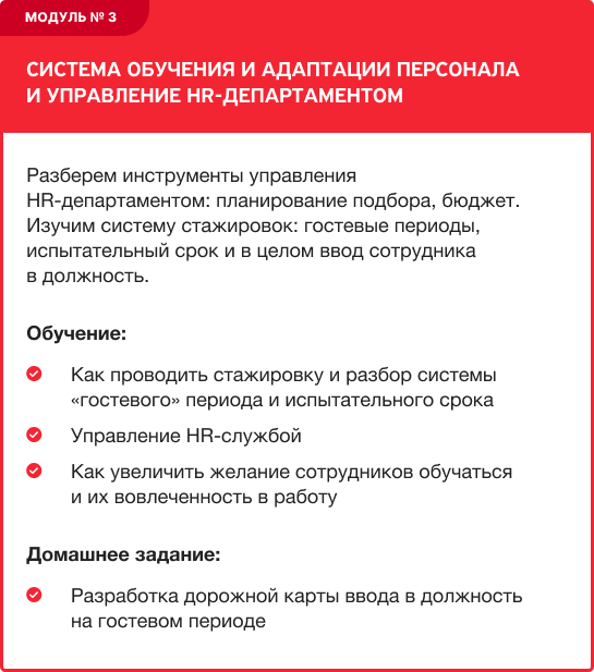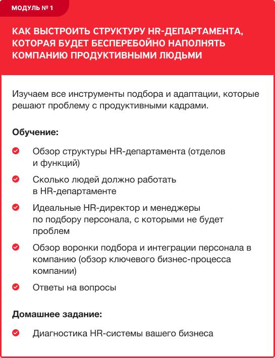 Нет! Структура нужна, чтобы понимать, какие функции вообще есть в вашей компании, а один человек может закрыть собой целый отдел или даже два. | | | Системный департамент персонала отвечает за весь цикл жизни сотрудника в компании. Сначала HR-отдел выстраивает программу тестового периода и стажировки, чтобы протестировать необходимые качества будущего сотрудника, а затем согласовывает его обучение, повышение и продвижение с руководителем и контролирует этот процесс. Обучаться должны все — и сотрудники, и собственник! Поэтому мы приглашаем вас на наш онлайн-практикум «Системный HR-департамент», где вы узнаете пошаговый план построения такого департамента персонала, который наполнит вашу компанию продуктивными сотрудниками и будет поддерживать и контролировать их эффективность. | | | | Позвоните нам, если у вас остались вопросы! 8 (800) 302-84-04 | | | | | Вы можете отписаться от рассылки в любое время, пройдя по ссылке. | | | © Copyright 2022 Handy Worker. Все права защищены. | | | |
