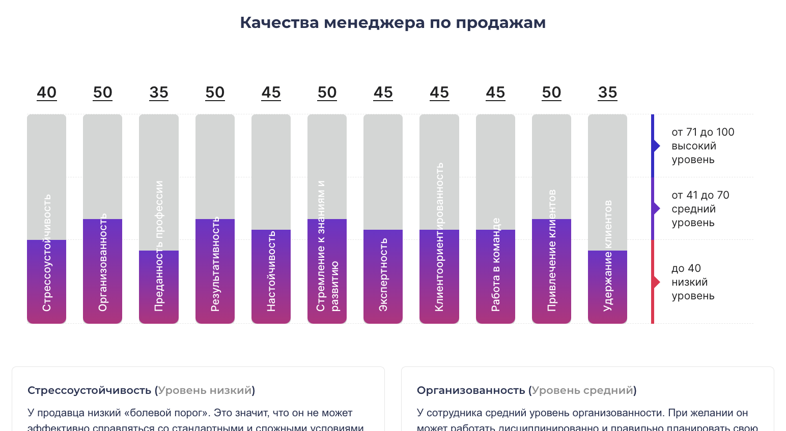 Специально для корректной оценки продавцов при найме был разработан универсальный тест из 110 вопросов. Заполняется за 15 минут. | | | | Тест на личностные качества менеджера по продажам | | | Результаты отражаются на графике в виде 11 точек: - стрессоустойчивость,