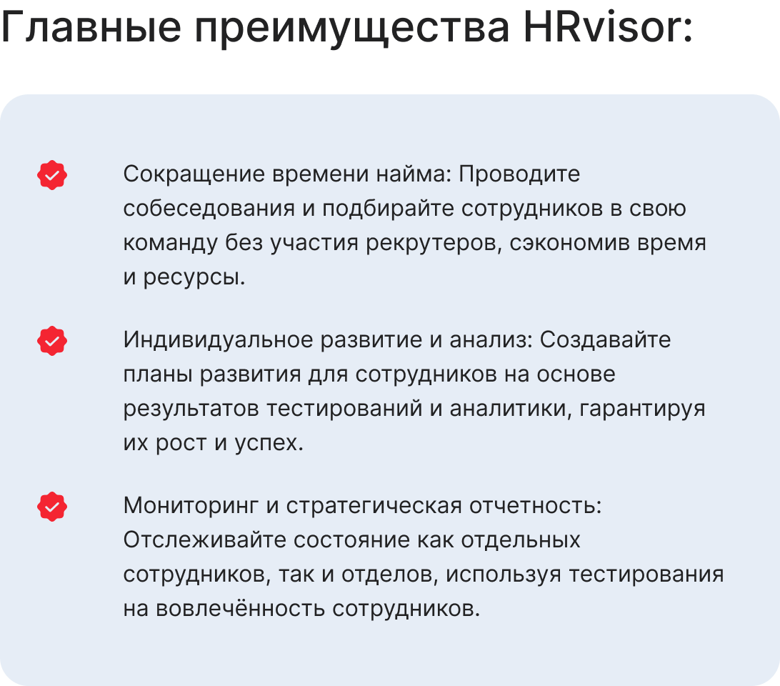 Сервис онлайн-оценки персонала HRvisor — это не просто платформа, а ваш верный помощник в развитии бизнеса. С этим инструментом вы сможете максимально эффективно управлять персоналом во всех аспектах, от найма до профессионального роста. |