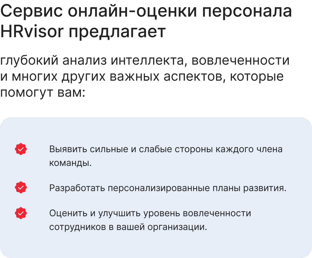 | Мы знаем, что формирование выдающейся команды — это залог успеха любой компании. Именно поэтому мы хотим представить вам уникальную возможность, которая поможет вам максимально раскрыть потенциал вашей команды и достичь новых высот. | | | | Чтобы вы могли убедиться в эффективности нашего сервиса, мы дарим вам 2 бесплатных тестирования при регистрации. Это ваша уникальная возможность оценить наши возможности и убедиться, что наш сервис соответствует вашим ожиданиям. | | | | Не упустите шанс повысить эффективность и успех вашей команды. Зарегистрируйтесь сейчас на сервисе HRvisor и начните путь к новым достижениям! | | | | Позвоните нам, если у вас остались вопросы! 8 (800) 302-84-04 | | | | | Вы можете отписаться от рассылки в любое время, пройдя по ссылке. | | | © Copyright 2023 Handy Worker. Все права защищены. | | | |