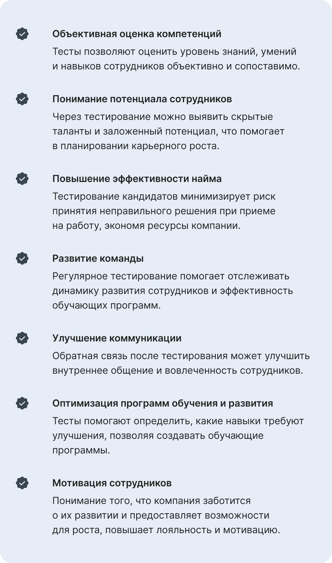 Попробуйте наши тесты для персонала. Это ваша возможность оперативно оценить компетенции сотрудников, определить их потенциал и мотивацию, чтобы вести команду к вершинам эффективности!