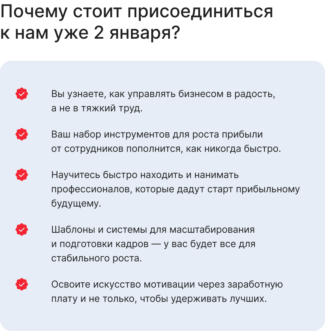 «Прибыльные сотрудники» — это не только название нашего обновленного 4-х дневного онлайн-практикума, это ваша новогодняя возможность для преобразования бизнеса. | | | | Каждый владелец заслуживает бизнес, который радует не только крупными цифрами прибыли, но и свободой, качеством жизни и командой, готовой брать на себя ответственность. Пора сказать «Прощай» усталости и «Здравствуй» сияющему будущему вашей компании! | | | | Уже более 240 предпринимателей прошли этот путь и трансформировали свою работу с персоналом в мощный двигатель успеха.