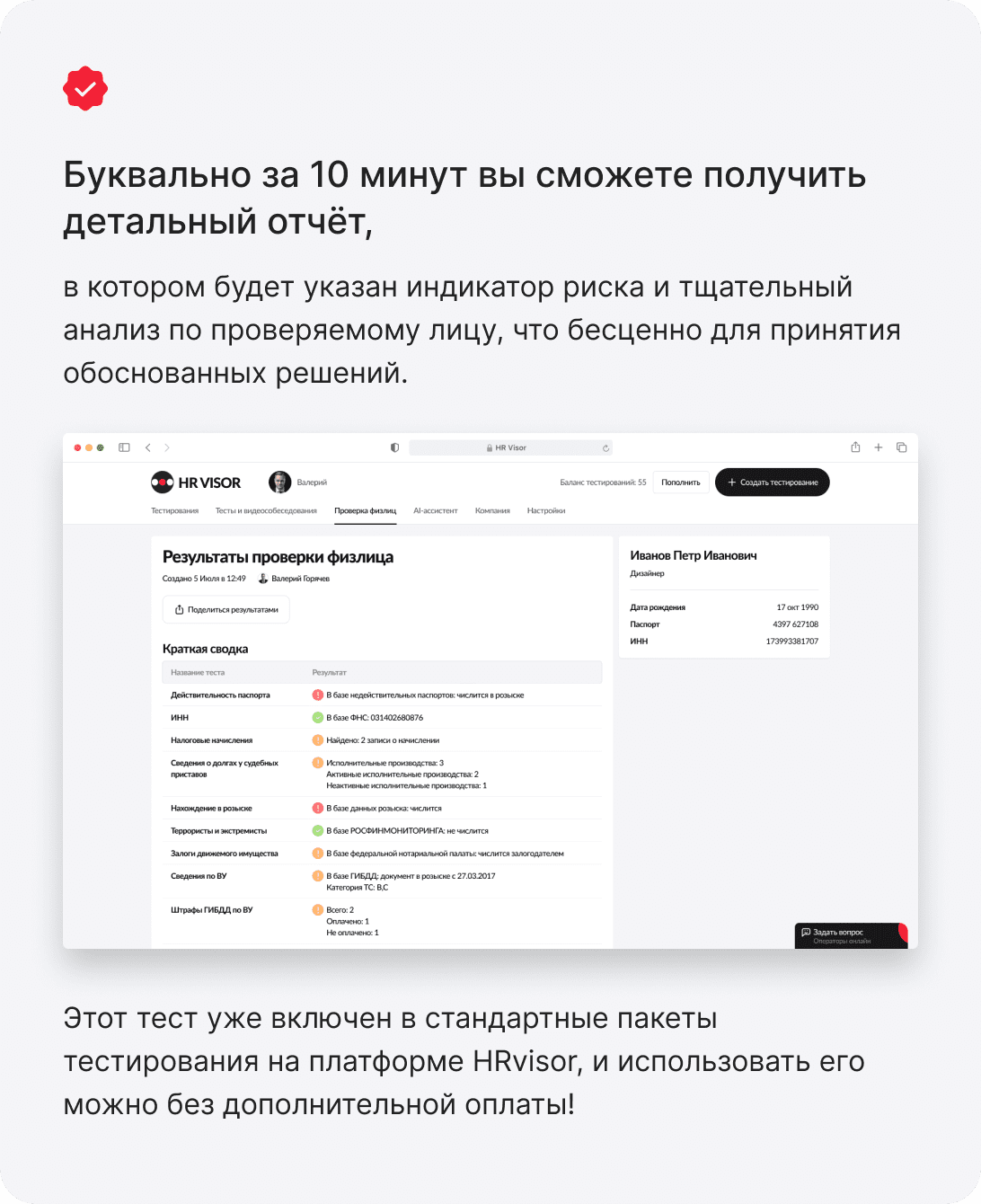 Этот тест — настоящий «юридический сканер», он позволяет быстро и эффективно проверять физических лиц по государственным базам и определять, насколько они подходят для вашего бизнеса с точки зрения безопасности и надежности. | | | | Базы данных, включенные в проверку: МВД, ФНС, ФССП, ГИБДД, Росфинмониторинг и другие. | | | | Не упустите возможность повысить уверенность в каждом нанятом сотруднике или выбранном партнере. Посетите платформу HRvisor и опробуйте новую проверку сегодня! | | | | Позвоните нам, если у вас остались вопросы! 8 (800) 302-84-04 | | | | | | © Copyright 2024 HRvisor. Все права защищены. | | | |