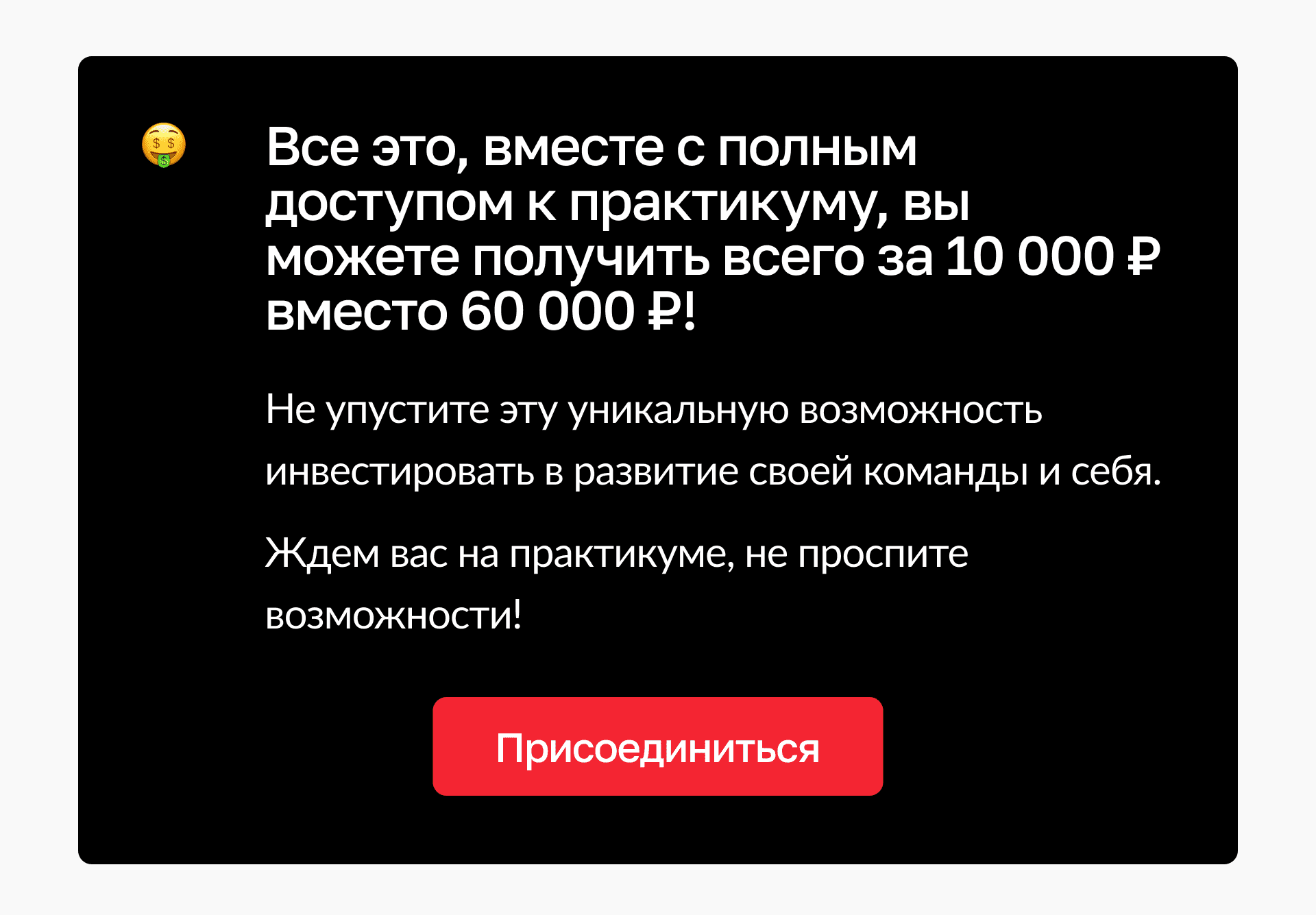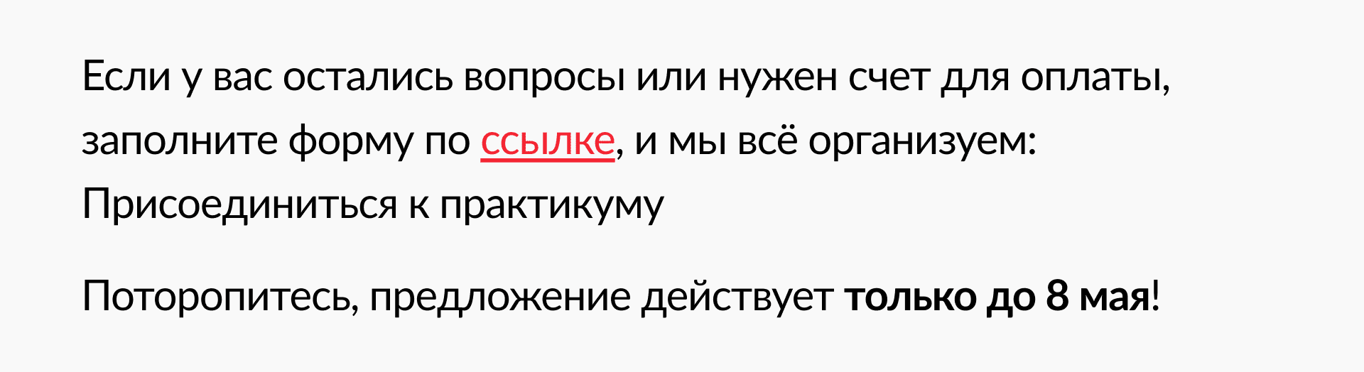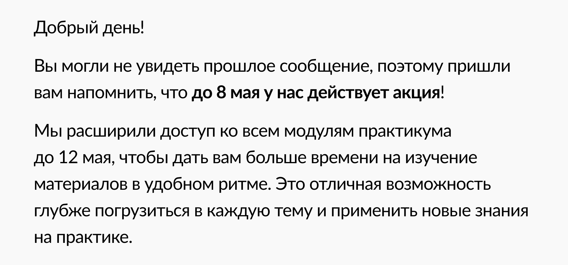 | Осталось 2 дня, чтобы сэкономить 50к. Добрый день! Вы могли не увидеть прошлое сообщение, поэтому пришли вам напомнить, что до 8 мая у нас действует акция! Мы расширили доступ ко всем модулям практикума до 12 мая, чтобы дать вам больше времени на изучение материалов в удобном ритме. Это отличная возможность глубже погрузиться в каждую тему и применить новые знания на практике. |