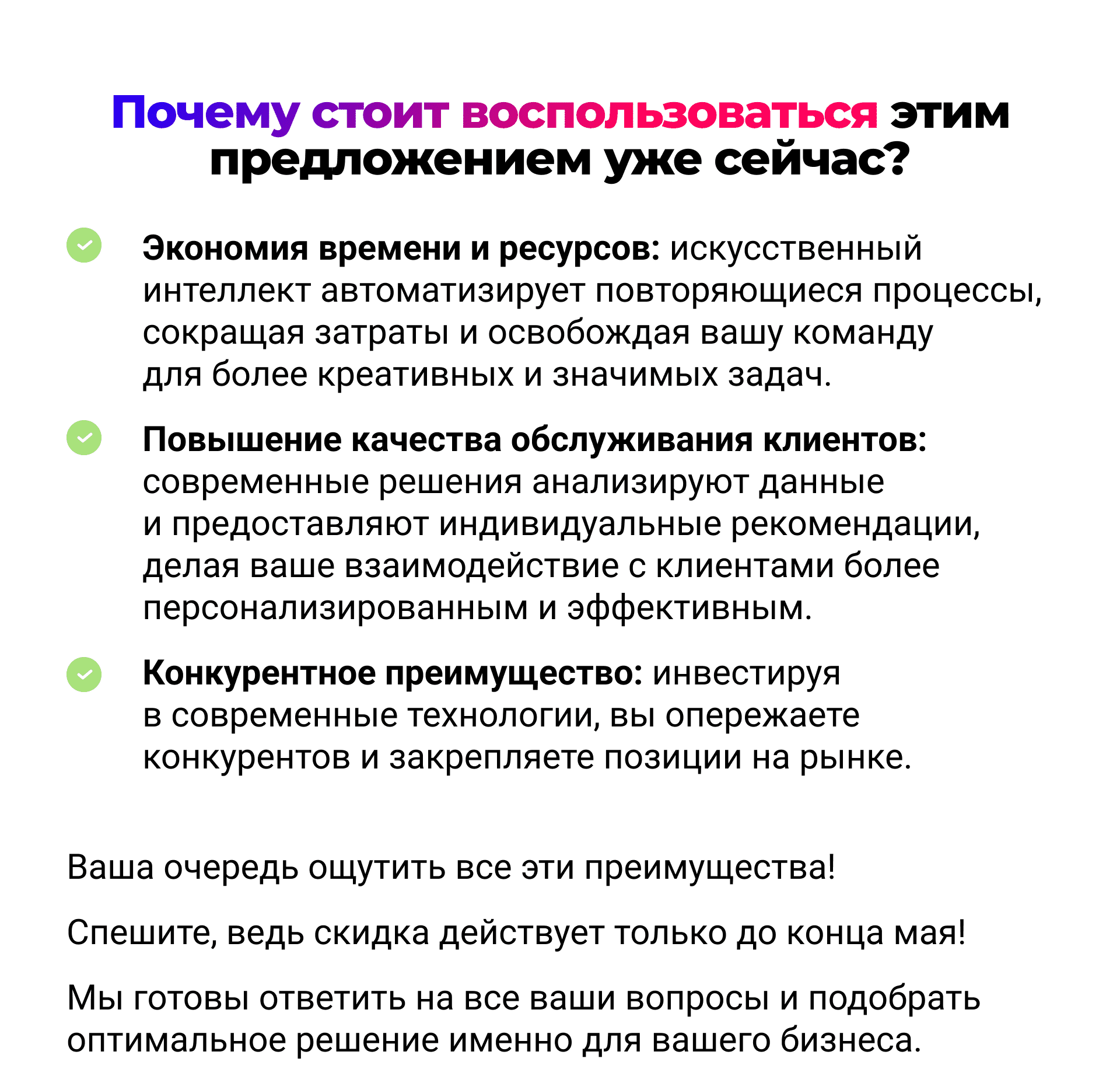 Вы уже успели познакомиться с нашими AI-ассистентами в ходе обучения и оценить их потенциал. Теперь пришло время воспользоваться полным спектром возможностей этого инструмента для вашего бизнеса! Только до конца мая мы предлагаем эксклюзивную скидку на подключение наших AI-ассистентов – это ваш шанс получить передовые технологии по выгодной цене.