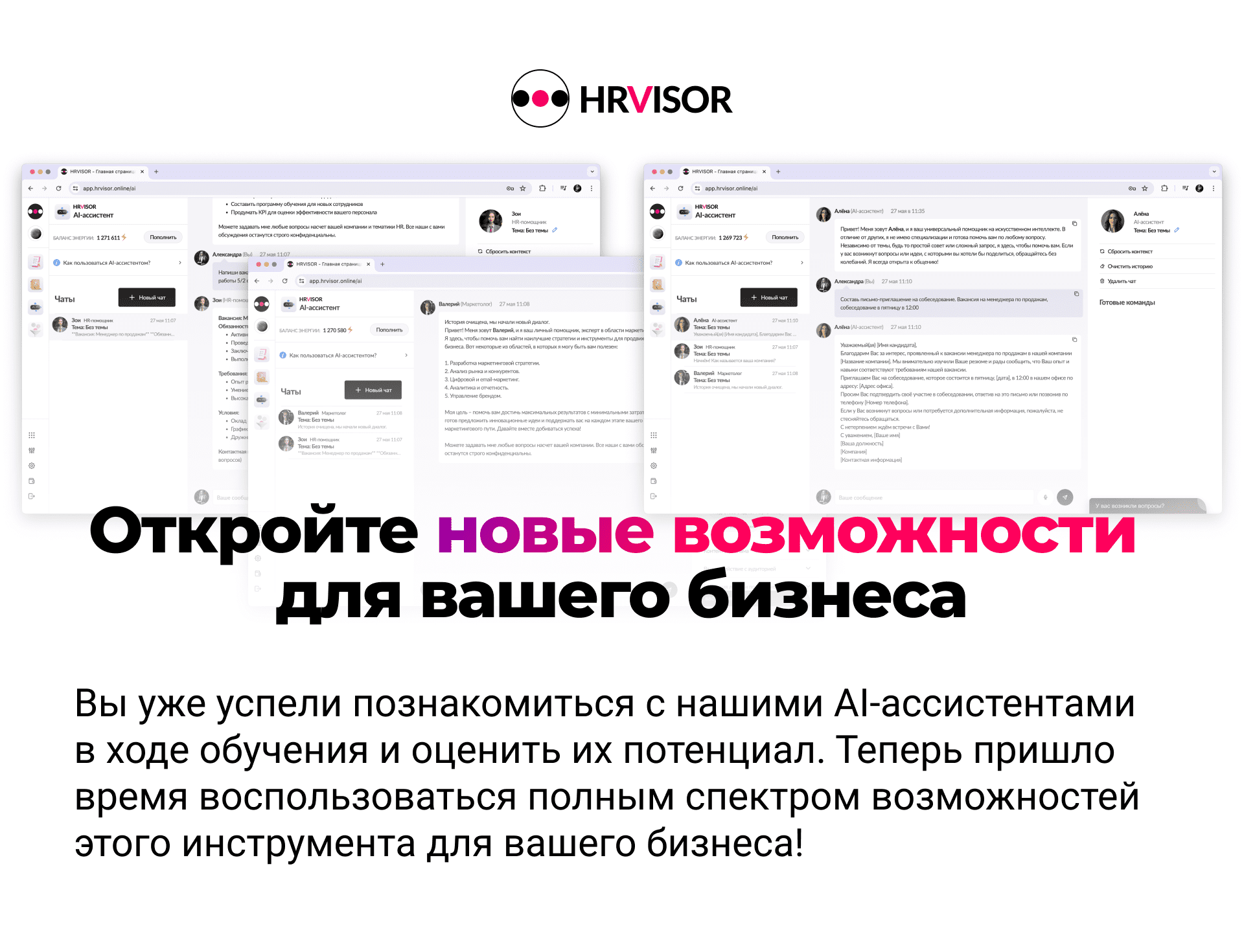 Вы уже успели познакомиться с нашими AI-ассистентами в ходе обучения и оценить их потенциал. Теперь пришло время воспользоваться полным спектром возможностей этого инструмента для вашего бизнеса!