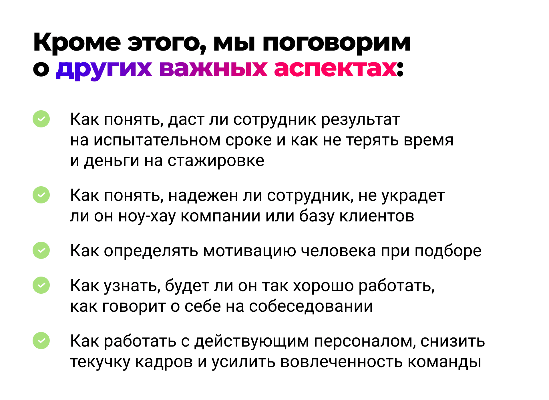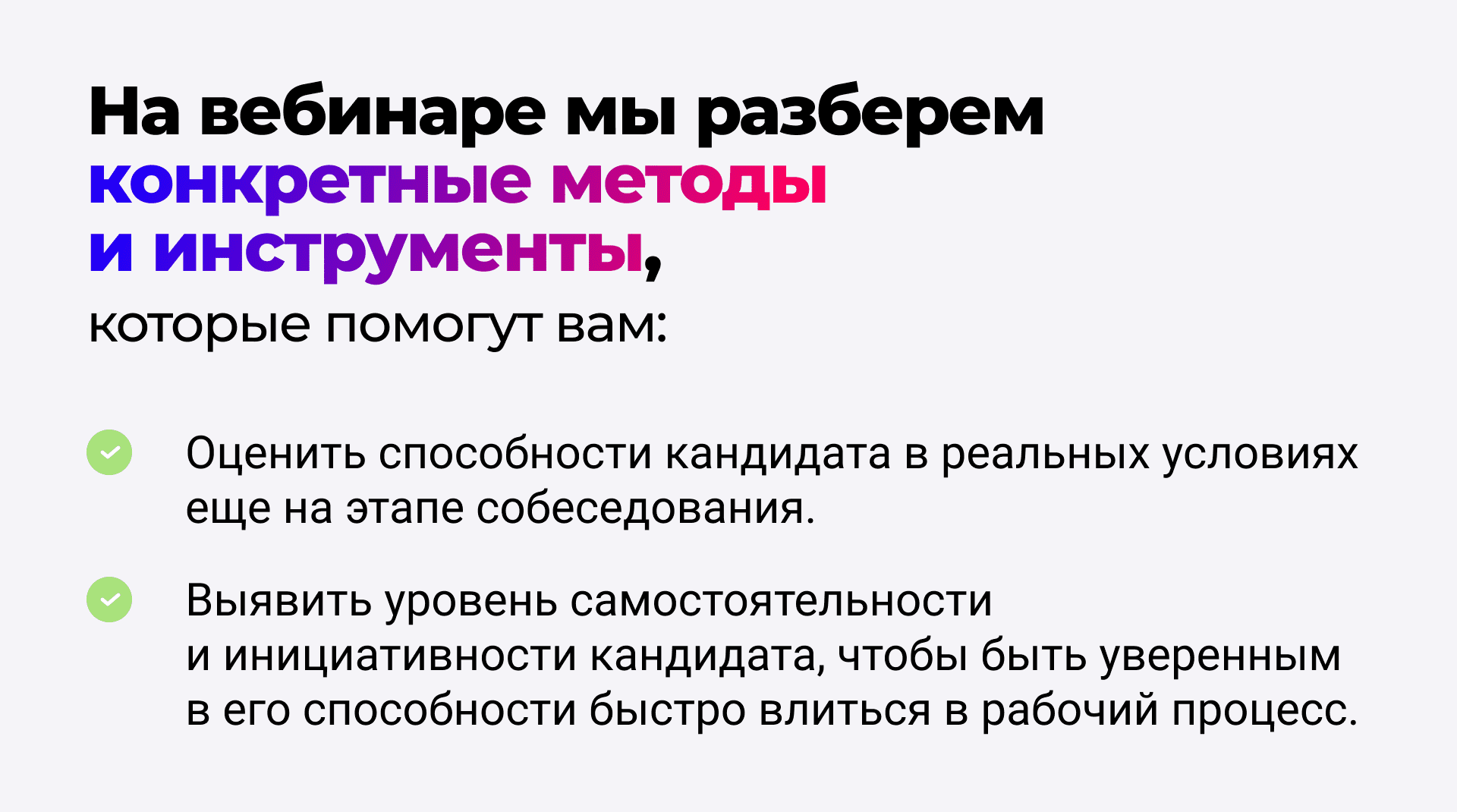 Хочу поделиться с вами небольшим инсайтом из того, что мы будем обсуждать. Например, как выяснить, будет ли сотрудник понимать задачи и выполнять их с первого раза. Мы знаем, что это одна из ключевых проблем при найме новых сотрудников. |
