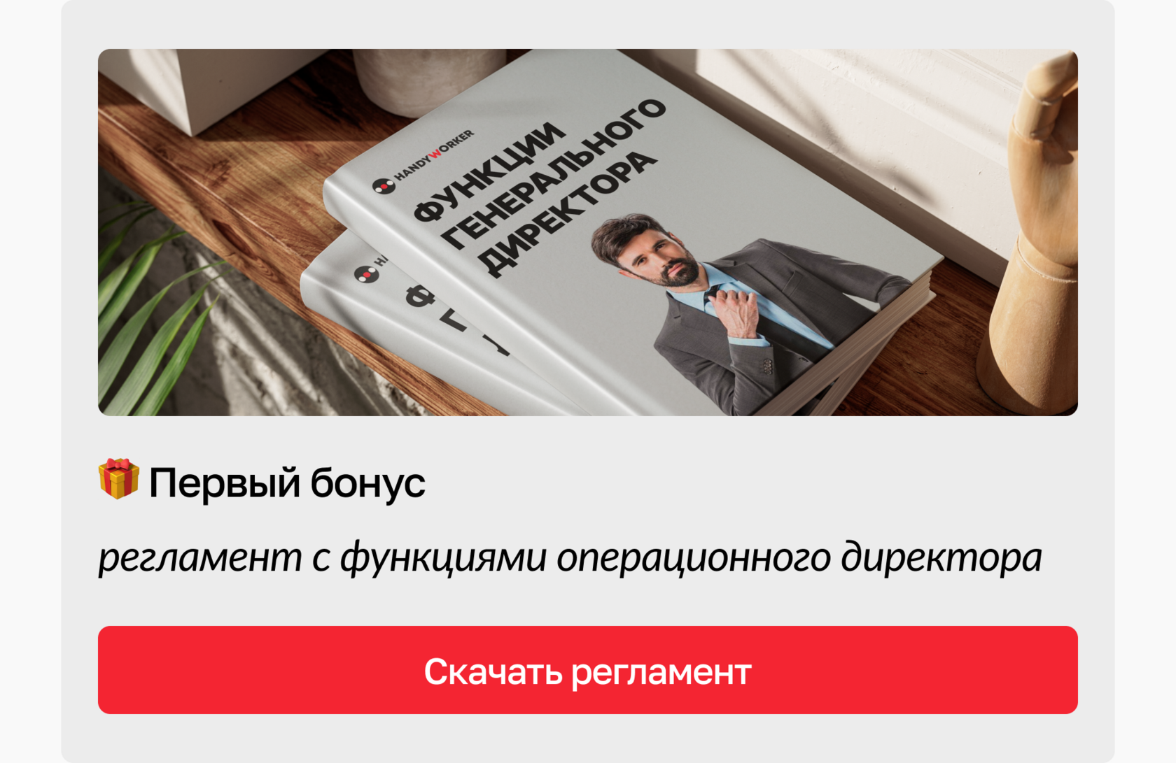 | Надеемся, что встреча с Валерием была для вас полезной и теперь вы знаете, что нужно делать, чтобы получать максимальную выручку и не думать каждый день, что делать с сотрудниками. | | | | Напоминаем, что до конца сегодняшнего дня у вас специальные условия на практикум | | | | За 4 дня вы разберетесь в инструментах, необходимых для системного HR, сделаете практические задания, которые помогут больше не принимать проблемы сотрудников и быстро их обучать и получите удовольствие от усиления своего бизнеса | | | Система быстрого найма и адаптации и снижения текучки, что уменьшит операционку и повысит прибыль ( info@handy-worker.com) © Copyright 2024 Handy Worker. Все права защищены. | | | |