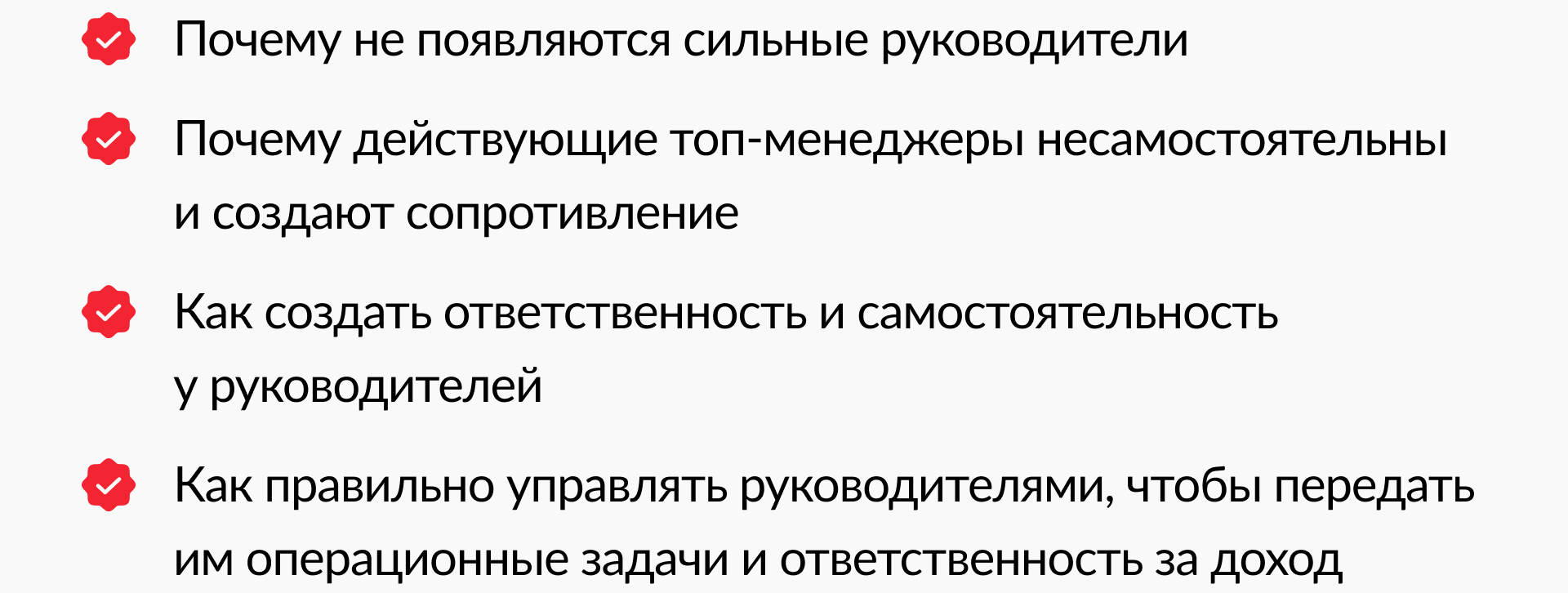 Чтобы помочь вам решить проблемы с созданием сильной и вовлеченной команды топов, которая сама контролирует ключевые направления бизнеса, я готовлю один из сильнейших мастер-классов.