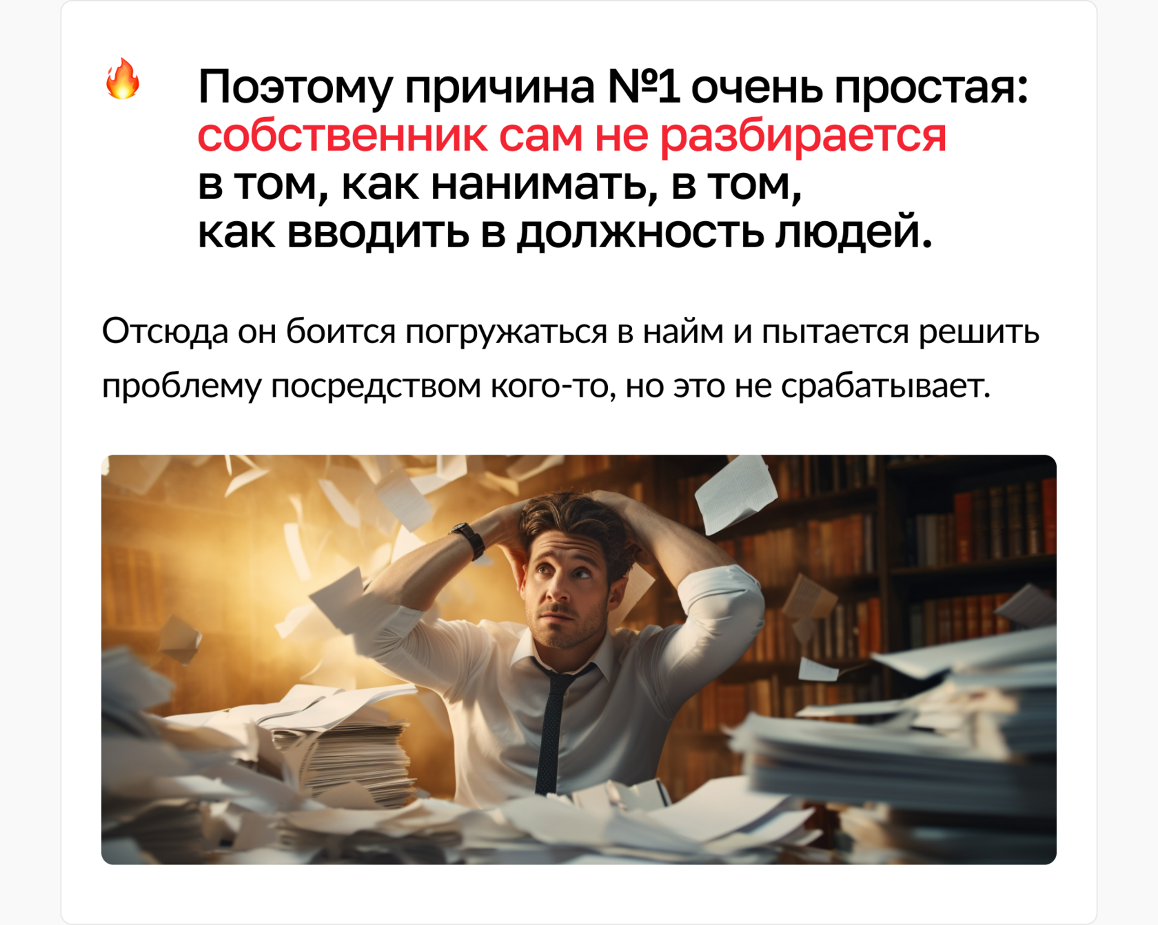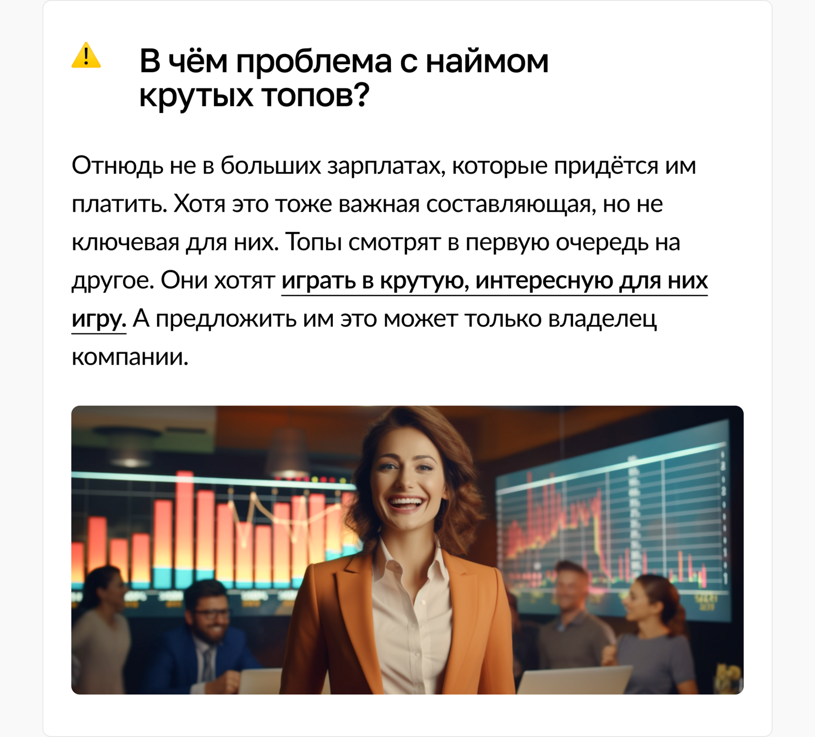 Поэтому именно собственник должен проводить собеседования с топами, продавать им идею работать в его компании. Конечно, вы можете подключить к найму HR-специалиста или руководителей. Но здесь их помощь ограничена. HR-специалист может собирать резюме, приглашать на собеседования, то есть создавать поток кандидатов. Но не собеседовать их, он — сотрудник совсем не того масштаба. Более того, такой «фильтр на входе» может только мешать. В любом случае, само собеседование, продумывание плана на стажировку, заработные платы, да и сама продажа идеи работать у вас — прерогатива собственника. Вы — единственный человек в команде, который может нанять крупнокалиберных сотрудников в свою компанию. |