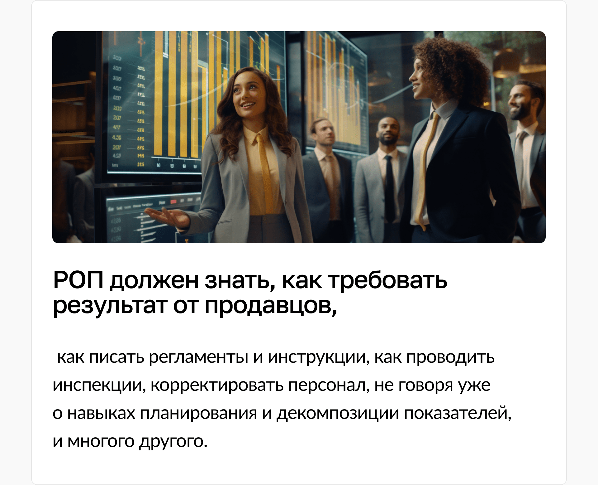 И именно эти качества и делают его крутым продажником. Но для того, чтобы быть успешным руководителем отдела продаж, нужны совсем другие качества. Да, знание того, как работает система продаж — это 100% нужно будущему РОПу, но это лишь маленькая часть. | | | | И вот вы берёте менеджера по продажам на позицию РОПа и видите, как он «ломается» через квартал, ну максимум через полгода. Всё потому, что он не обладает инструментарием руководителя и не совершает того самого переключения из позиции продавца. Он пытается старыми подходами решать новую задачу.