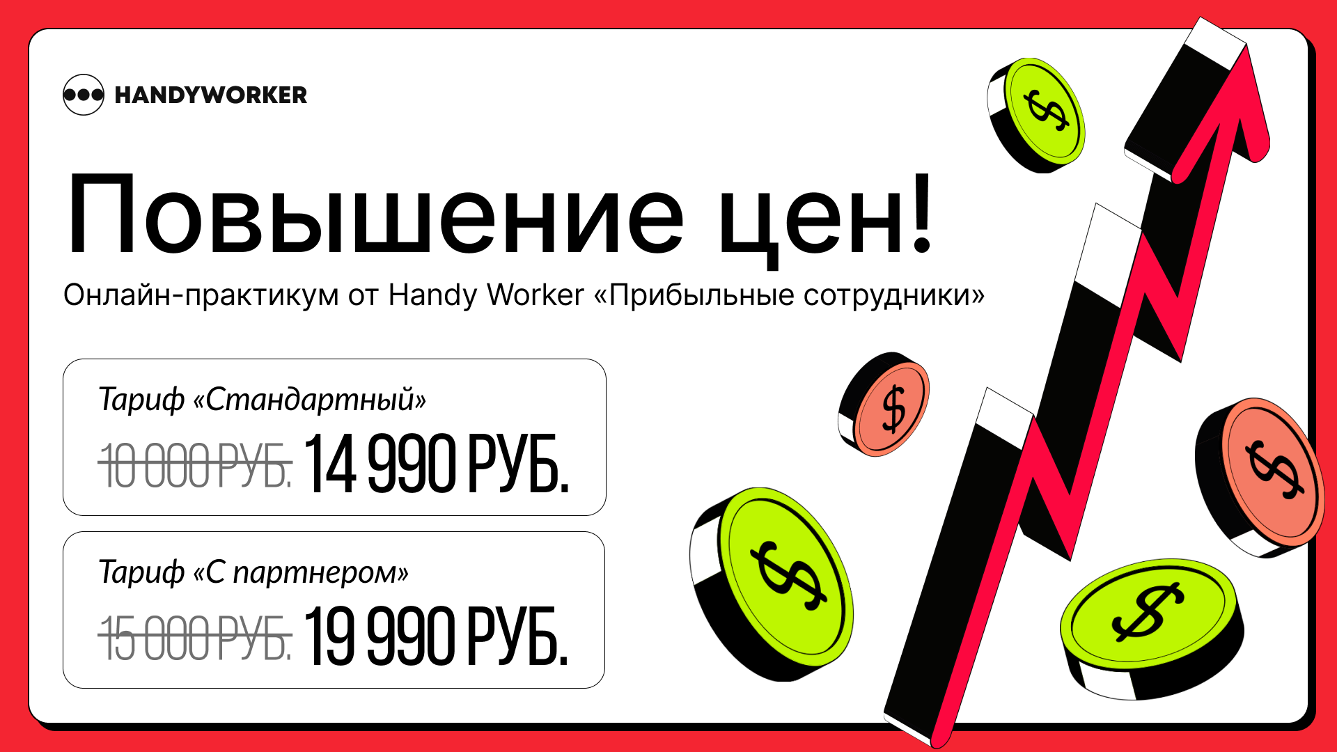 Мы больше года оставляли цену на наш онлайн-практикум «Прибыльные сотрудники» без изменений, чтобы как можно больше предпринимателей могли получить знания. Однако, к сожалению, инфляция, рост цен на рекламу, индивидуальное сопровождение и другие расходы вынуждают нас увеличить стоимость. |