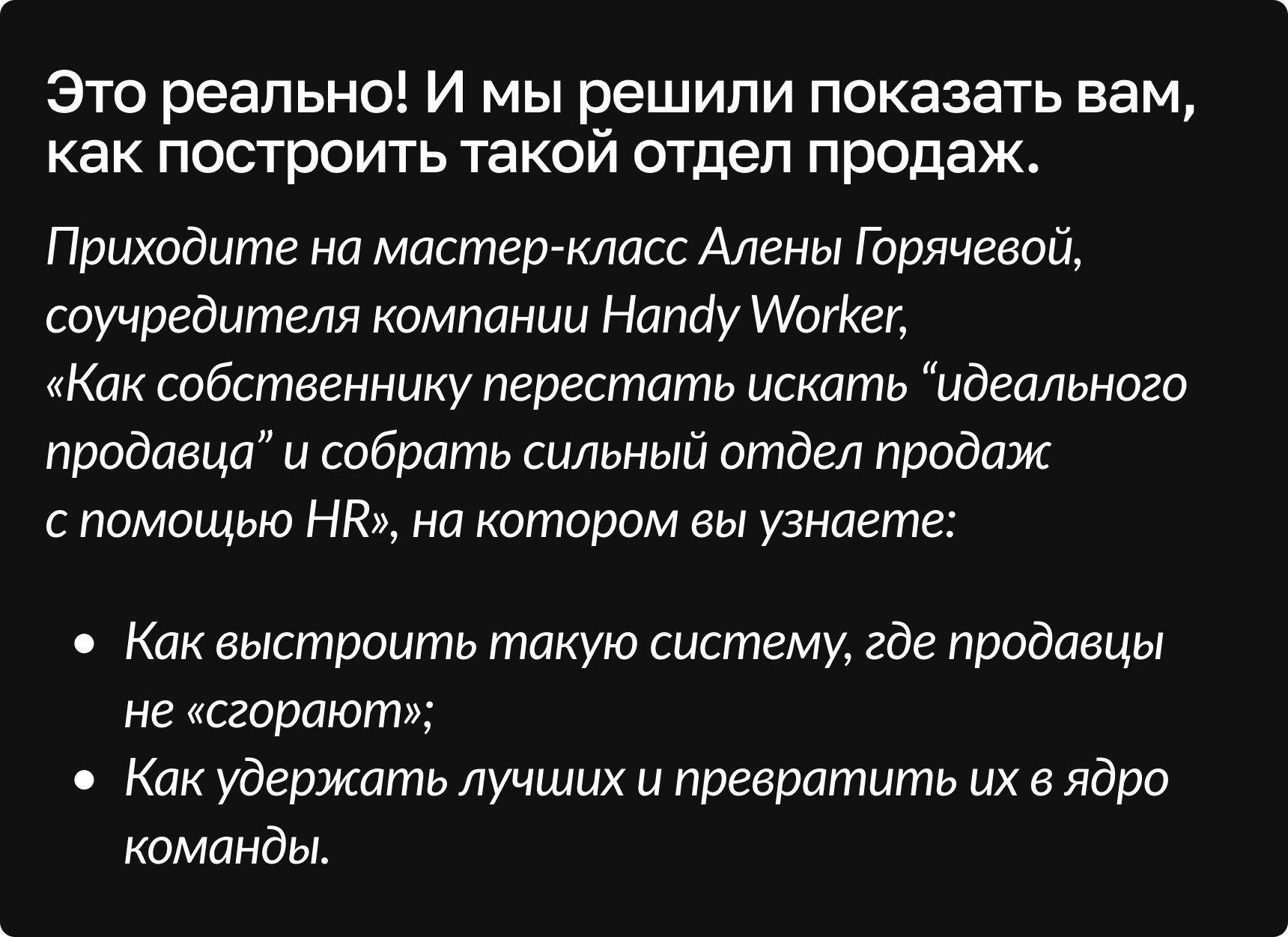 А теперь представьте отдел продаж, где сотрудники работают по году и дольше — с энтузиазмом, результатом и внутренней мотивацией. |