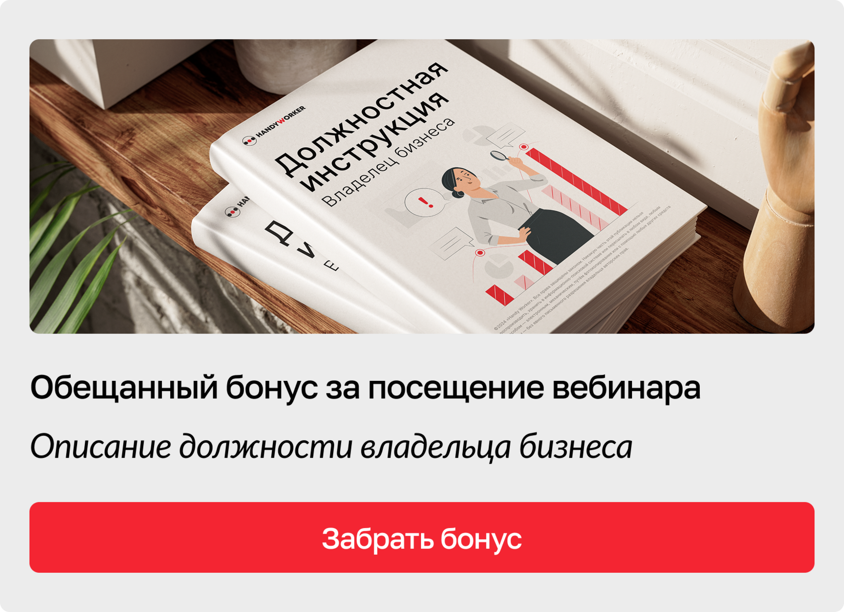 | Держите бонус за то, что были со мной в эфире! Честно, не ожидал такого отклика. Спасибо, что были со мной! 🔥🔥🔥 | | | | Специальное предложение, которое доступно только тем, кто был на мастер-классе | | | | Этот интенсив нужен каждому предпринимателю, который хочет сохранить коллектив и не терять деньги на повторный найм. | | | | Что вы получите в результате: | | | | Предложение действует 24 часа после мастер-класса! Успейте занять место и изменить свою команду! | | | Система быстрого найма и адаптации и снижения текучки, что уменьшит операционку и повысит прибыль ( info@handy-worker.com) © Copyright 2025 Handy Worker. Все права защищены. | | | |