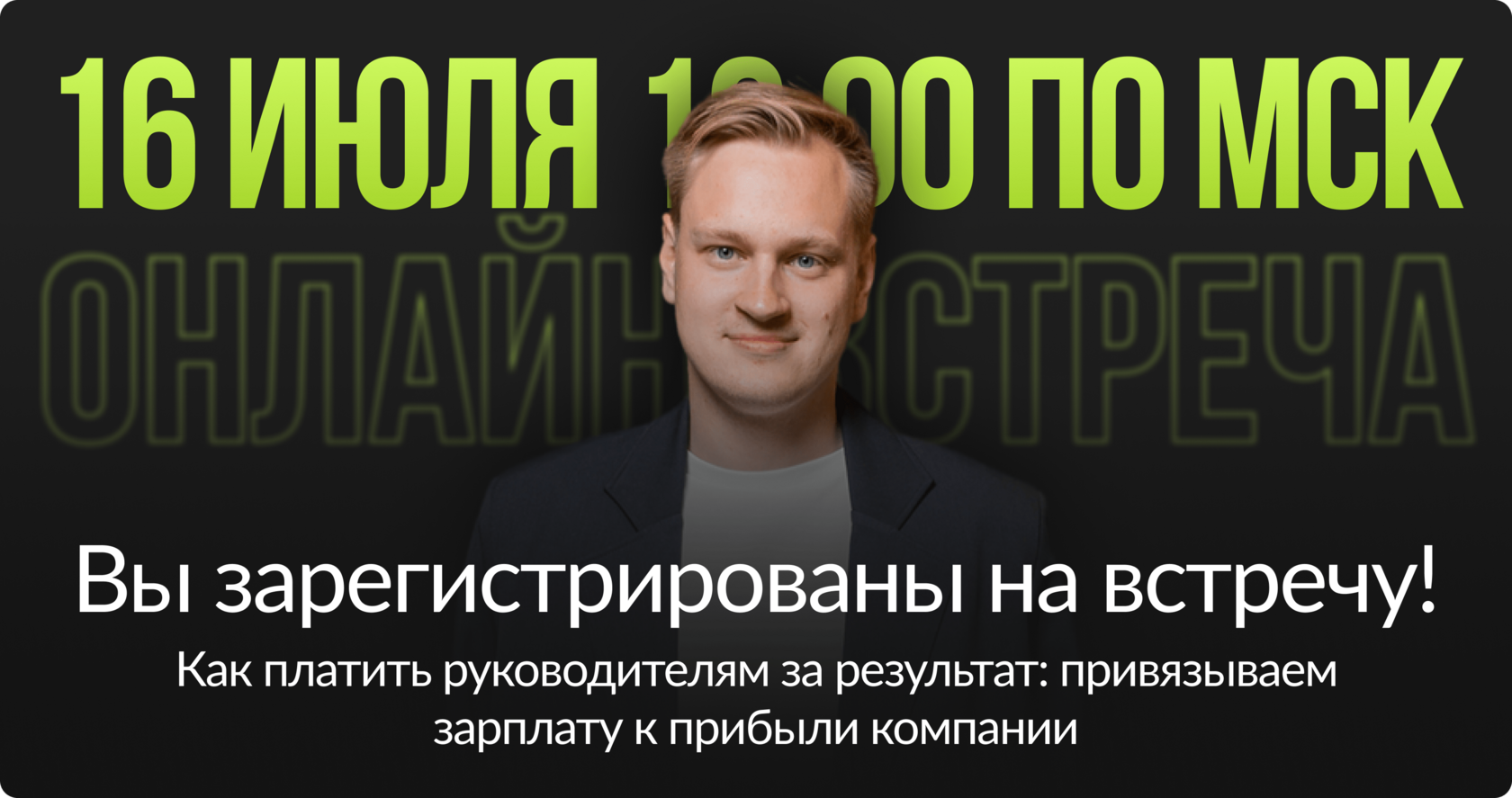 Ура! Регистрация на онлайн-встречу Валерия Горячева «Как платить руководителям за результат: привязываем зарплату к прибыли компании» готова. А теперь немного подробнее.