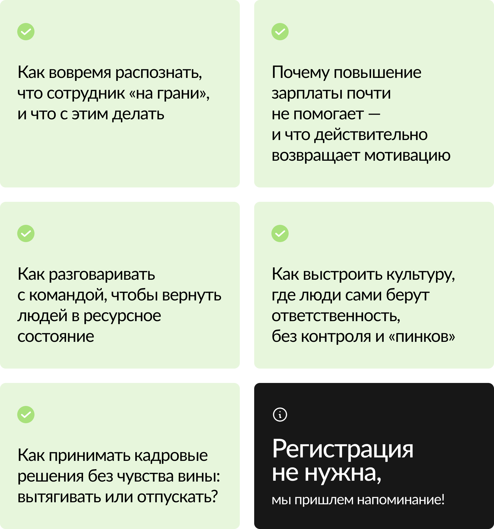 | Приглашаем вас на закрытый мастер-класс Алёны Горячевой «Перезагрузка персонала: как собственнику вылечить команду от выгорания и ошибок», который мы проводим специально для наших постоянных клиентов. | | | | значит, самое время навести порядок и вернуть энергию в команду. | | | | На мастер-классе вы узнаете: | | | | Формат: онлайн, участие бесплатное!