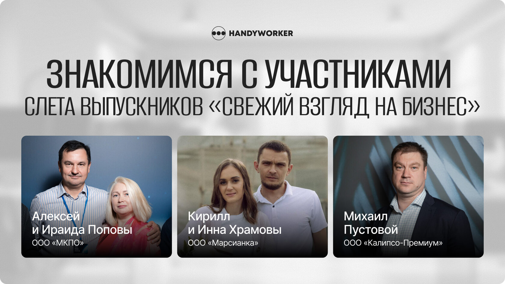 | Продолжаем знакомиться с участниками слёта выпускников Handy Worker! 🚀 | | | | Алексей и Ираида Поповы — ООО «МКПО» | | | | Производство металлооборудования, Московская область. 60 человек в команде, ежемесячный оборот — 20 млн рублей. | | | | Кирилл и Инна Храмовы — ООО «Марсианка» | | | | Сеть магазинов профессиональных товаров для ногтевого сервиса + производство собственной косметики для ногтей. 18 сотрудников, годовой оборот 100 млн рублей. г. Алматы, Казахстан. | | | | Михаил Пустовой — ООО «Калипсо-Премиум» | | | | Оптовая и розничная торговля мебелью. Более 30 лет помогают своим клиентам создавать действительно невероятные интерьеры! 28 сотрудников, годовая выручка — 300 млн рублей. Нижний Новгород. | | | | Присоединяйтесь к нашим участникам 27 июня в Москве! Ждем встречи с вами😎 | | | Система быстрого найма и адаптации и снижения текучки, что уменьшит операционку и повысит прибыль ( info@handy-worker.com) © Copyright 2025 Handy Worker. Все права защищены. | | | |