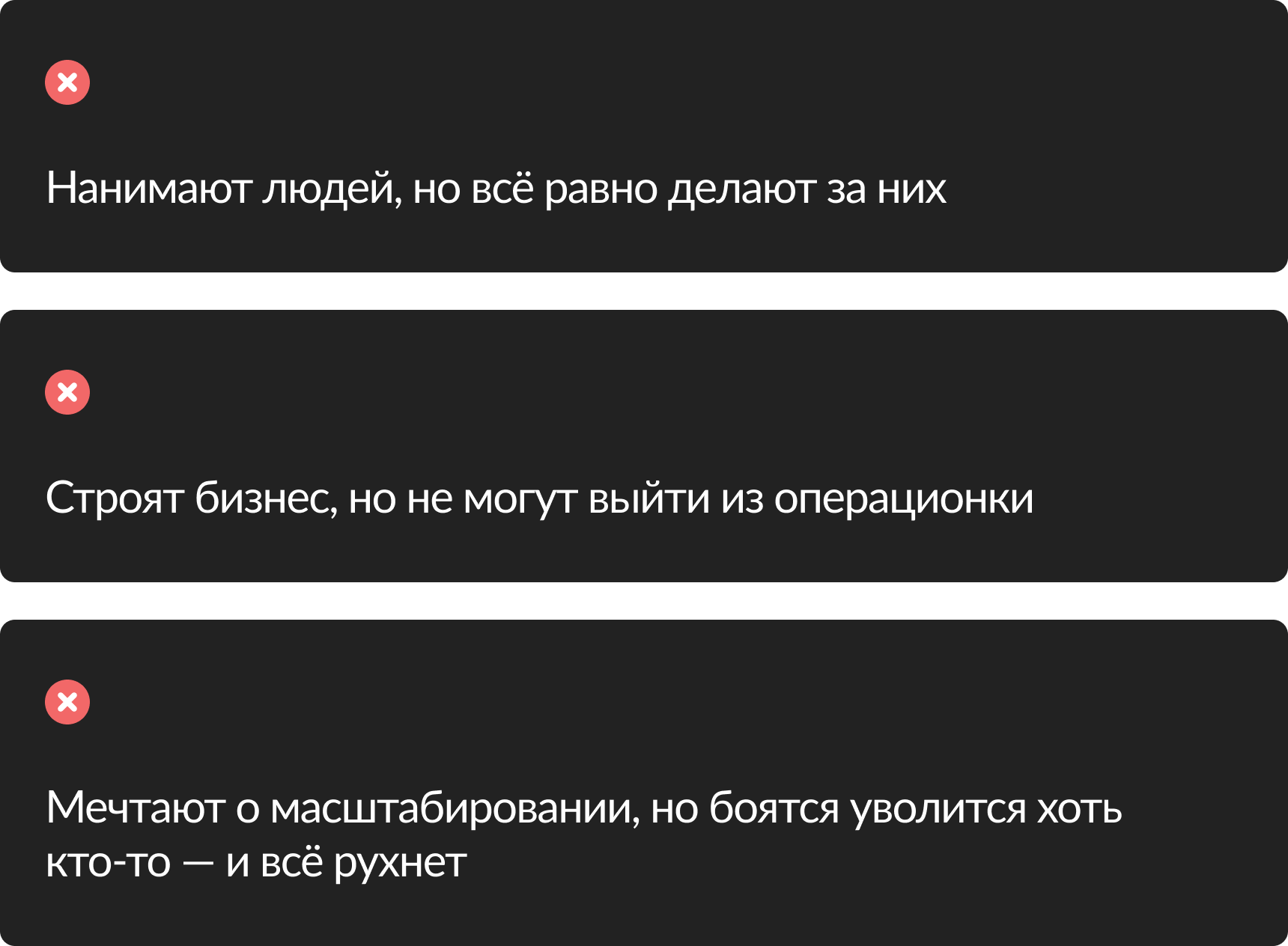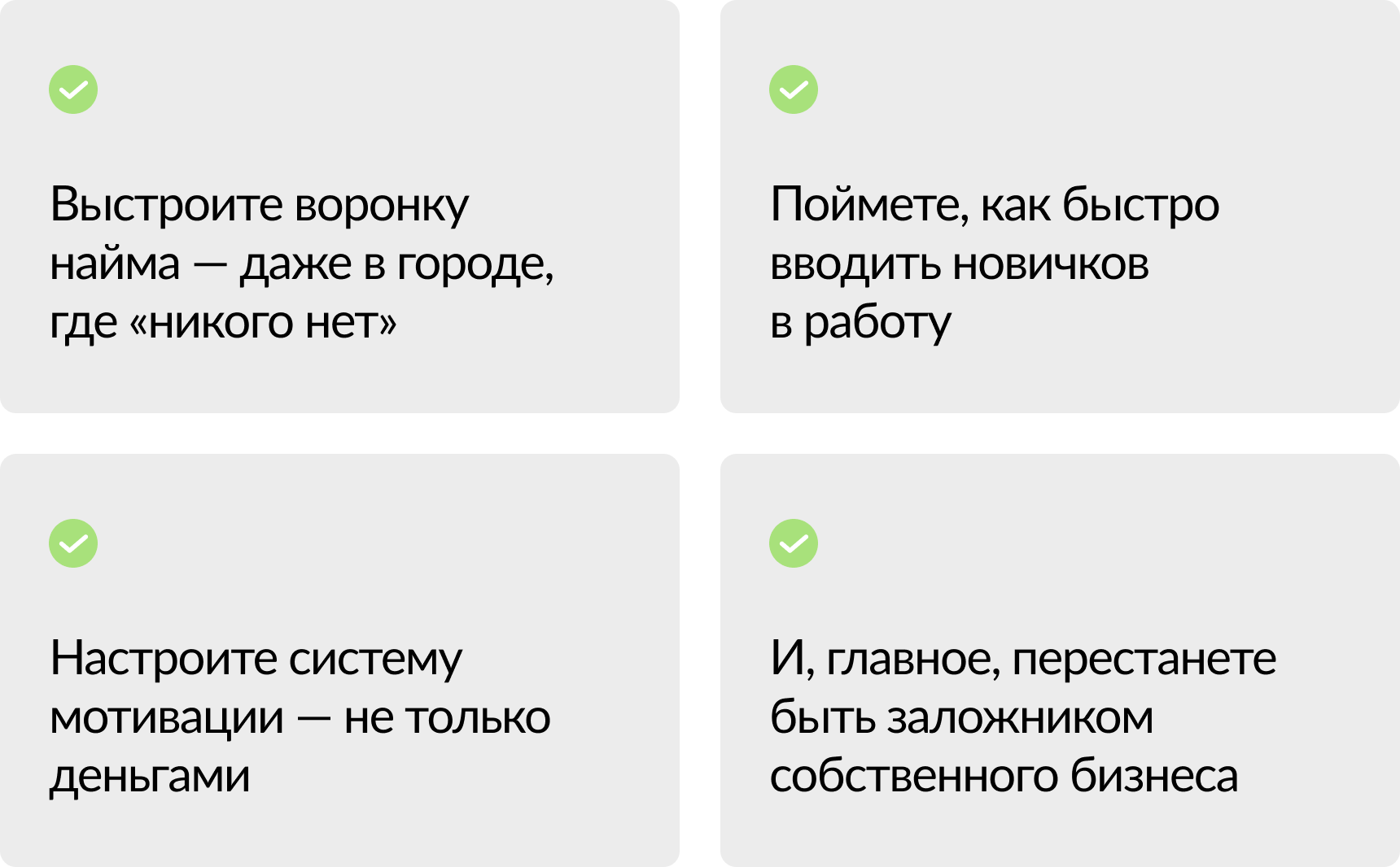 | «Вы проводите на работе дни и ночи, а результат нулевой. Всё завязано на вас как на собственнике или руководителе. И вам приходится самостоятельно всё разруливать. А бизнес, вместо роста и свободы, превращается в чемодан без ручки — вы тащите, но бросить жалко». | | | | Если вы узнали себя — вы не один. Так живут десятки тысяч предпринимателей: | | | | Но дело не в сотрудниках. И не в рынке труда. Проблема в том, что у вас нет системы, как с ними работать. | | | | Валерий Горячев собрал собственный опыт работы, компании Handy Worker и наших клиентов и написал практический учебник «Не хватает людей», в котором вы: | | | | «Когда система есть — наем становится рутиной, сотрудники работают без надзора, а бизнес растёт — не за счёт вашего личного напряжения, а за счёт команды» | | | Система быстрого найма и адаптации и снижения текучки, что уменьшит операционку и повысит прибыль ( info@handy-worker.com) © Copyright 2025 Handy Worker. Все права защищены. | | | |