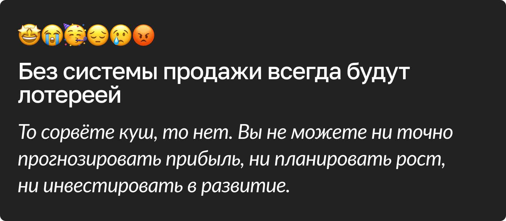 И вот эта фраза «как пойдёт» выдает главную проблему. Продажи у него идут хаотично: один месяц — густо, другой — пусто. А план существует только на бумаге, чтобы в конце месяца объяснять, почему он не выполнен. | | | | Это как ехать на дальняк без карты и без навигатора. Иногда случайно сворачиваешь в нужный поворот, но чаще — уезжаешь в глушь и теряешь время. | | | | Когда в продажах есть система, всё предсказуемо: | | | | 17 сентября в 16:00 на мастер-классе «Как выжать максимум из продаж в кризис» я покажу, как построить такую систему, чтобы планы по выручке перестали быть «как пойдёт» и стали гарантированным результатом. | | | Система быстрого найма и адаптации и снижения текучки, что уменьшит операционку и повысит прибыль ( info@handy-worker.com) © Copyright 2025 Handy Worker. Все права защищены. | | | |