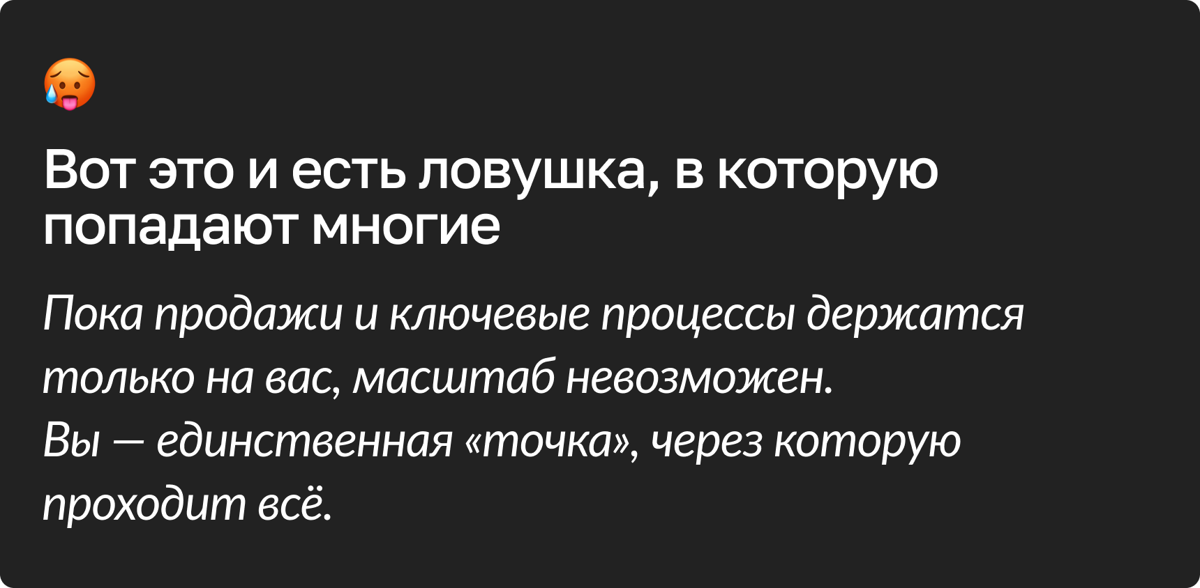 Я спросил: — Что будет, если вы уедете на месяц, например, на Мальдивы? Он усмехнулся: — Месяц? Да я даже на два дня на рыбалку в Рязань не могу уехать спокойно. Всё развалится. | | | | В итоге вместо того, чтобы развивать стратегию, вы бесконечно тушите пожары: | | | | Так можно жить годами, но бизнес при этом будет буксовать, потому что любая попытка «отпустить» процесс оборачивается провалом.