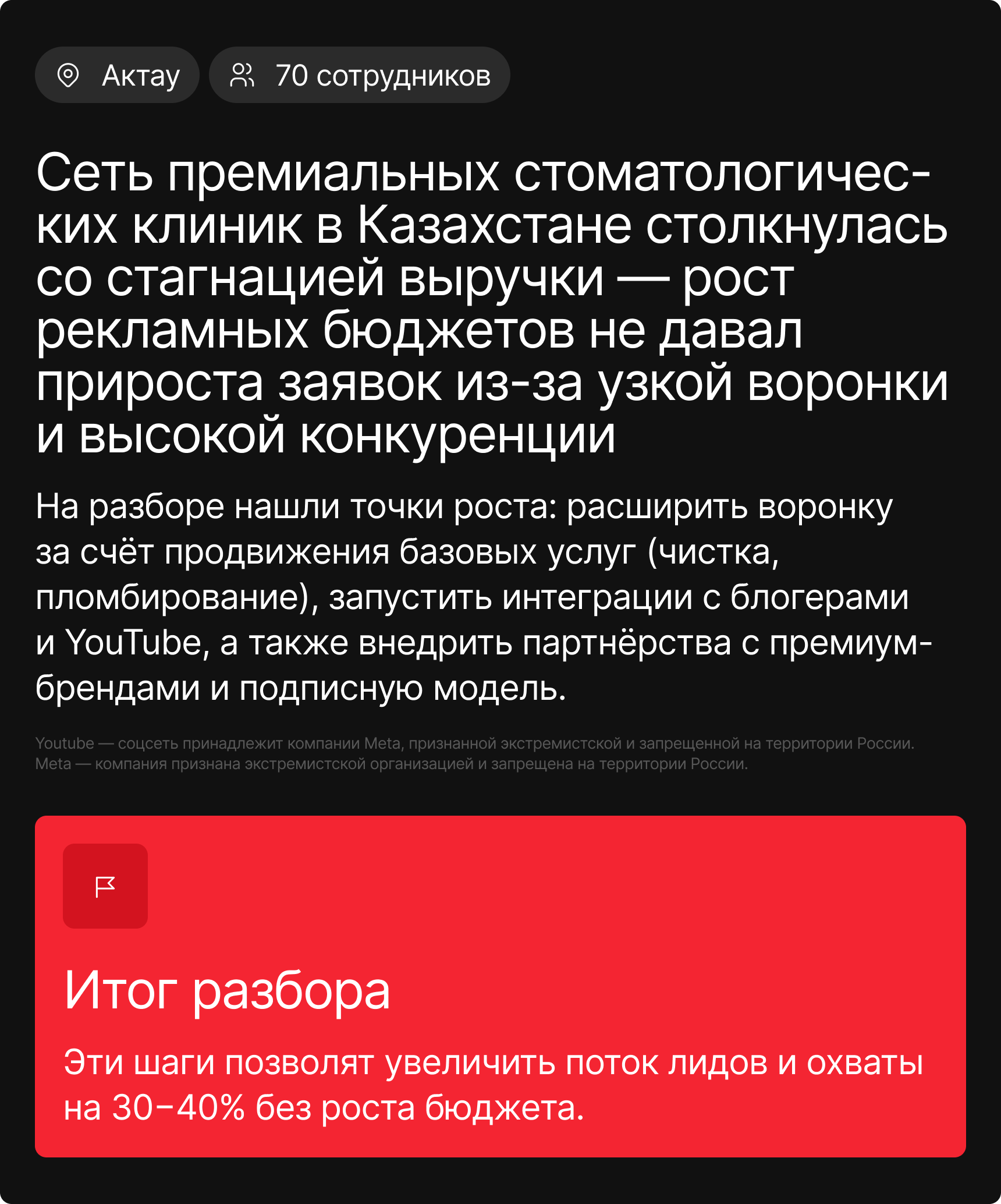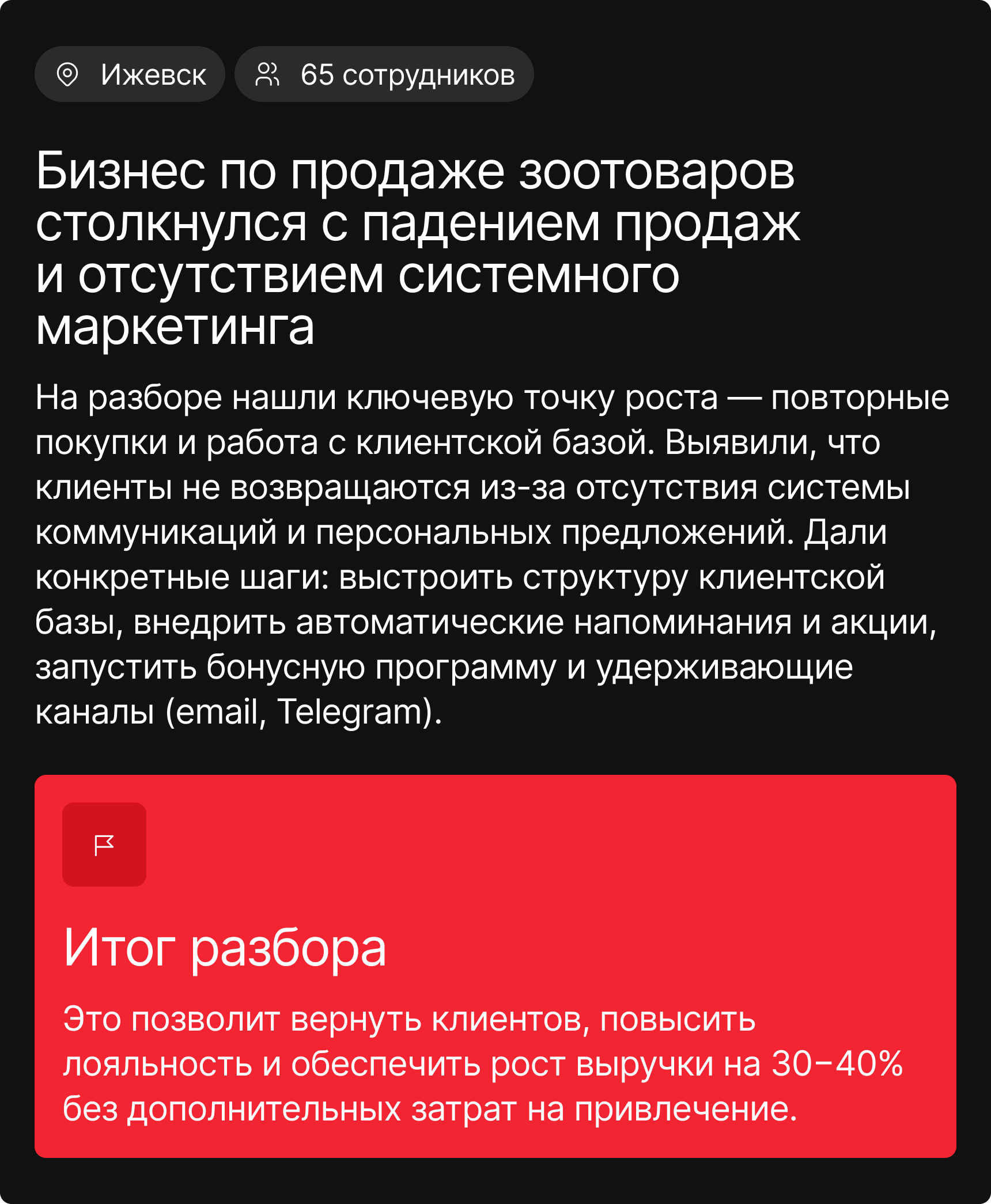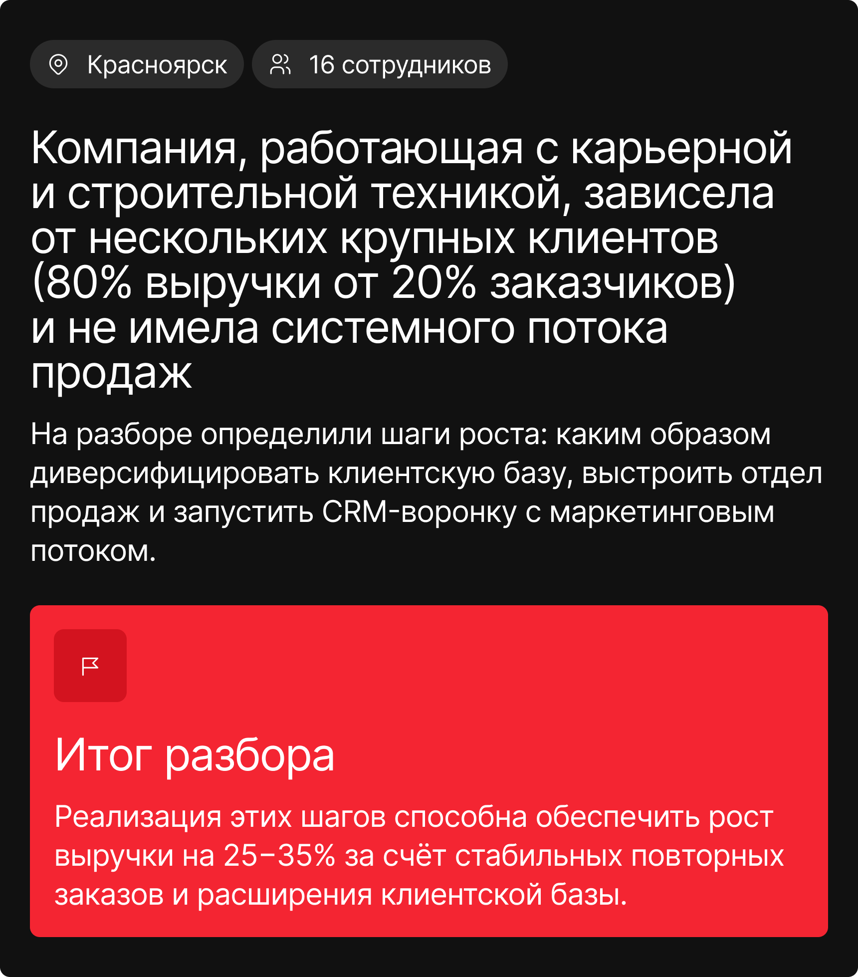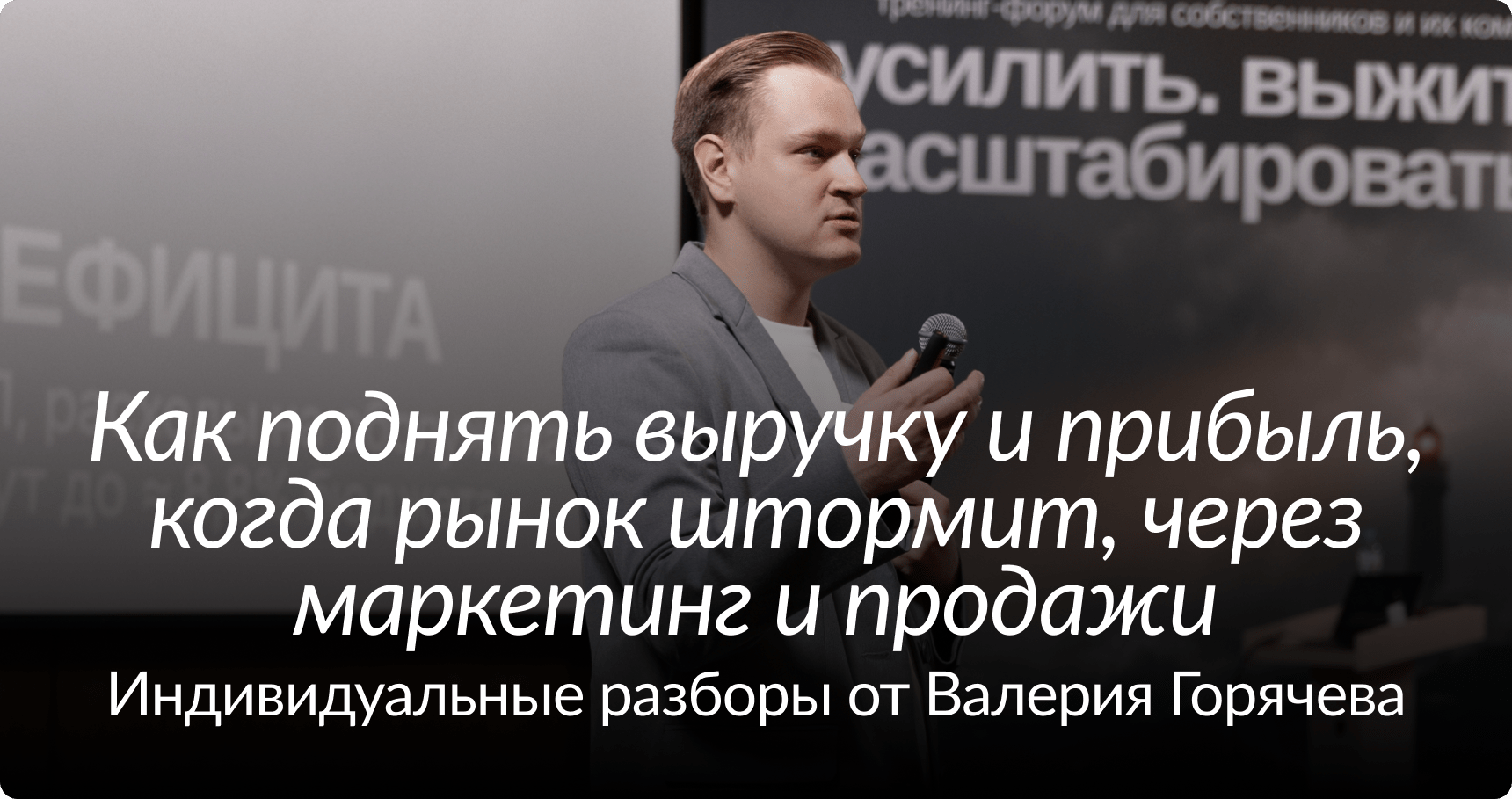 | Если у вас падает доход, отдел продаж не справляется, меньше квалифицированных лидов, растет стоимость клиента или просела конверсия в продажах — на встрече вы кратко рассказываете о своей ситуации, а Валерий проводит персональный разбор. На выходе — 2−5 шагов исправления ситуации с продажами и маркетингом под вашу нишу и ресурсы.